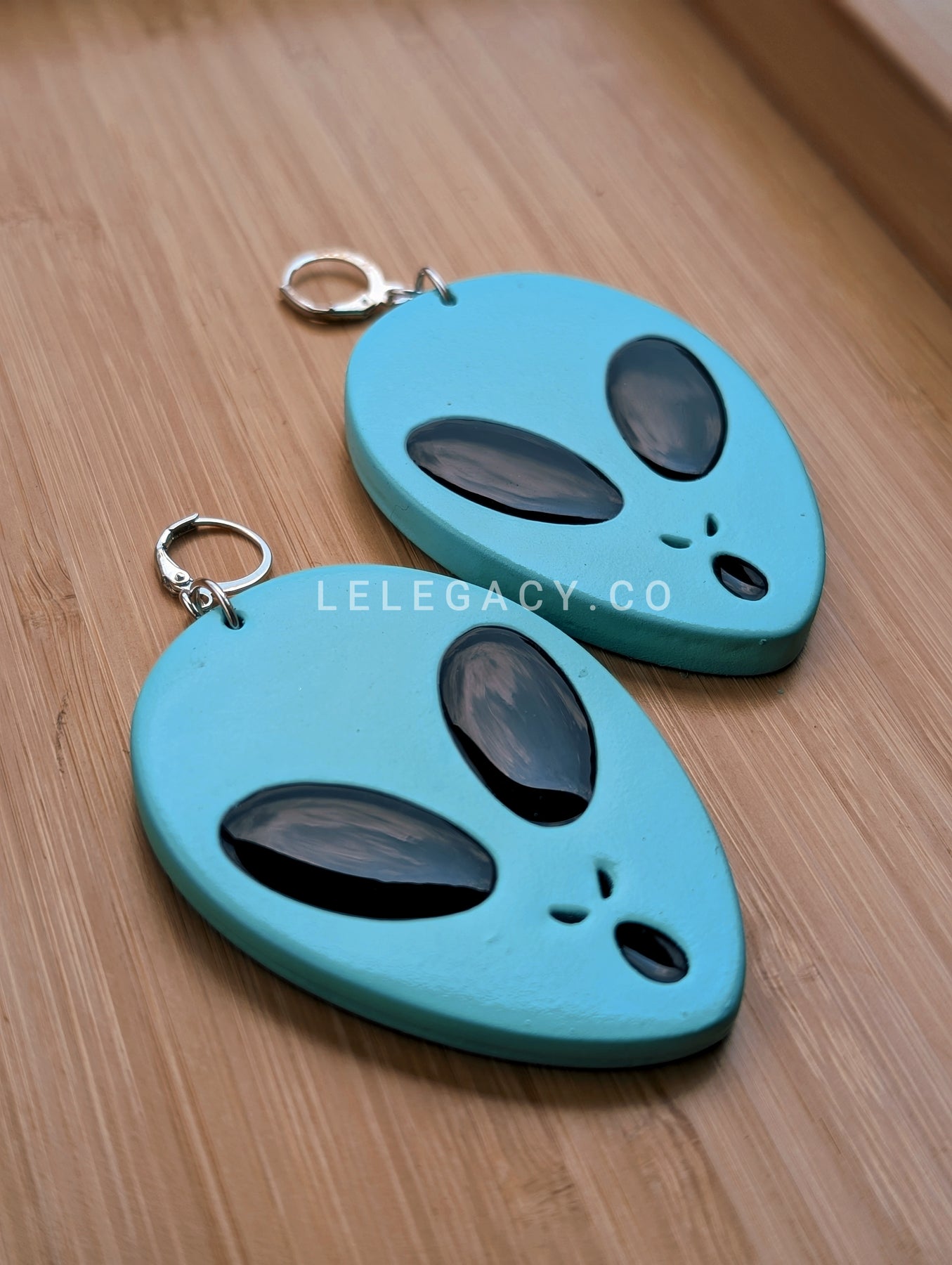 Our alien shaped earrings are handcrafted from laser cut wood and fastened on clasp earrings. Product comes with (2) Alien Earring pieces. Choose between lever backs or clip ons.